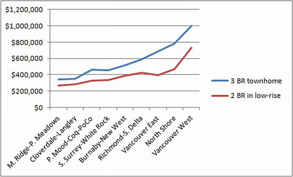 Collier’s, a real estate firm, has released a survey of apartment and townhome sale prices in Metro Vancouver during the first quarter of 2012.  As close to the City as  Burnaby-New Westminster, three-bedroom townhomes cost half as much as those in Vancouver West (Kitsilano, Point Grey.)  The price break in suburbs to the east is even greater.  Other surveys over time have shown that the same pattern applies to detached homes.