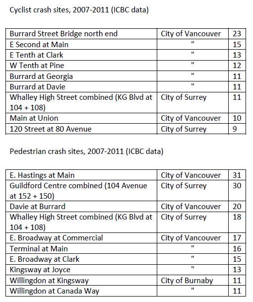 The Insurance Corporation of British Columbia periodically posts data on crash locations in Greater Vancouver — looking through the rear-view mirror at sites that reported crashes from 2007 through 2011. [Note that this post refers to ICBC’s 2012 report; the corporation has deleted this report and posted newer numbers.]