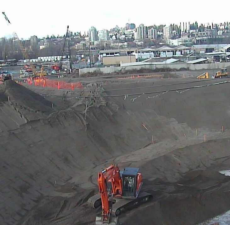 Even so, a part of the four-lane road is now in operation. It starts bravely at the 176 Street exit from the Trans-Canada Highway, but it peters out at Bolivar Park near 136 Street, five point something kilometres short of the Pattullo Bridge. Work on the remainder of the road is moving along; the Ministry of Highways has set up cameras at six locations to record construction, and stop-action galleries are available online [2016: no longer available.]