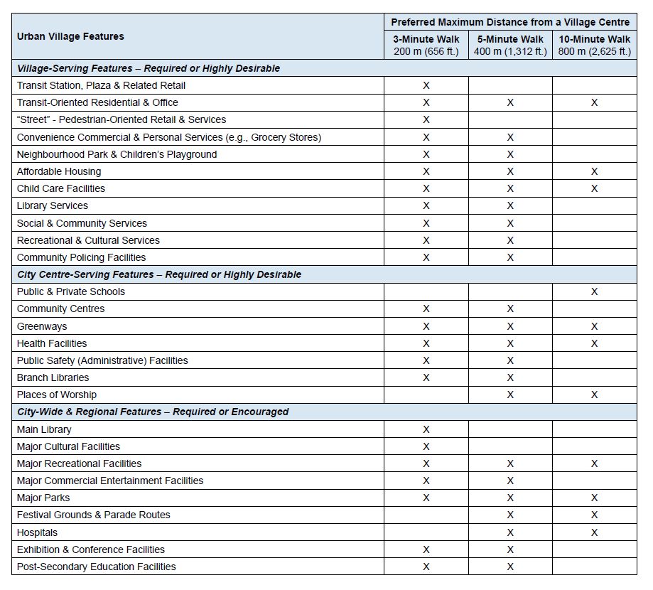 The second tier takes in “City-Centre Serving Features”, drawing in folks from nearby core neighbourhoods but clearly contributing to life in the village. These features include recreational paths, schools, community centres and places of worship.