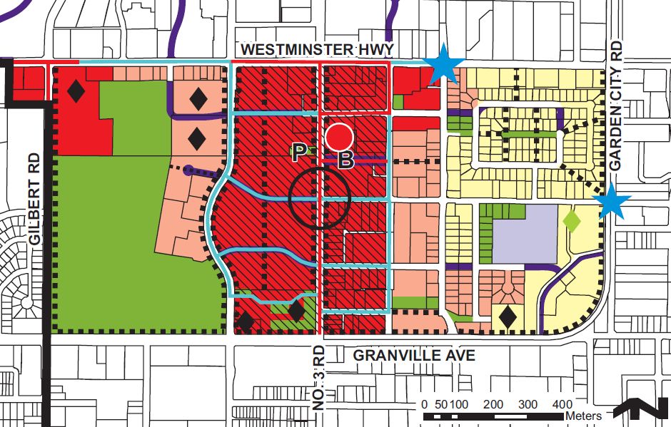 Land use map for Brighouse Village from the 2009 Richmond Central Area plan. The colours, from right to left, signify townhomes, dense mixed use, even more dense mixed use, and park. The diamonds mark institutional uses.