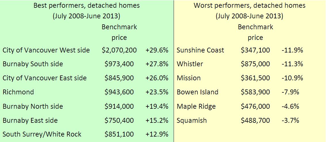 Region-wide, selling prices for detached homes in the Greater Vancouver real estate area  (including Howe Sound and the Sunshine Coast) have gone up by 15% over five years, compared with 6% in the Fraser Valley area (including Surrey).