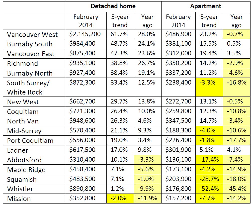 The table below presents the five-year price trend to the end of February 2014, and compares it with the five-year trend to the end of February 2013. In every market selected, the market for houses has strengthened. The same is true for apartment prices in most areas, although the gap between apartment and house prices continues to widen.