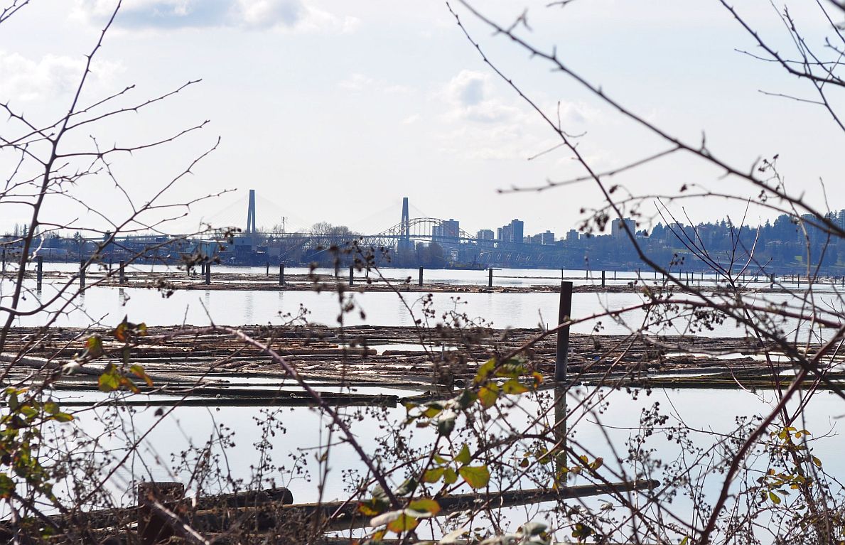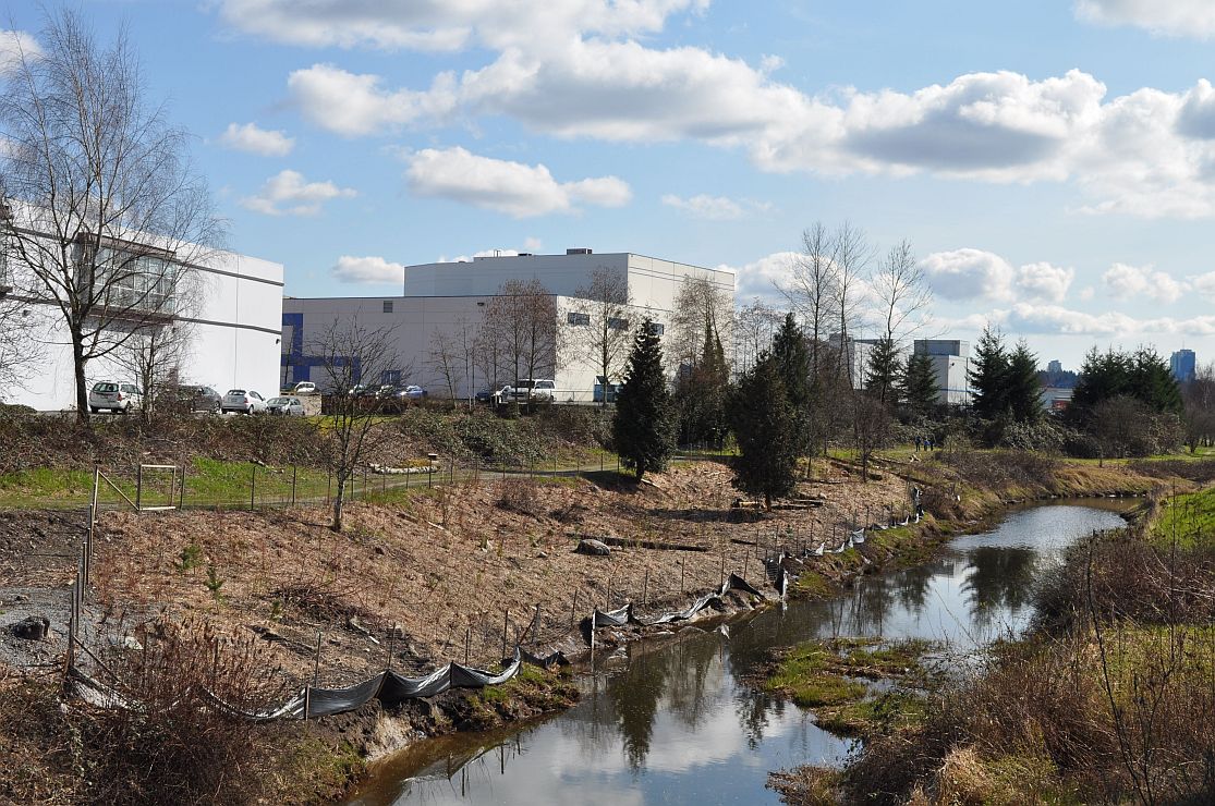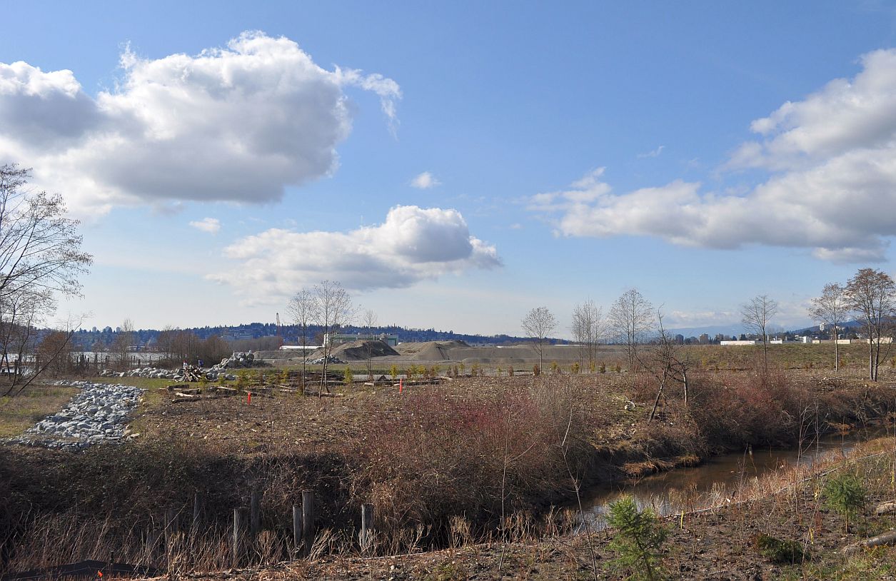 Looking across Como Creek to the proposed site of the Coquitlam waterfront village. The hillside in the left background is New Westminster.