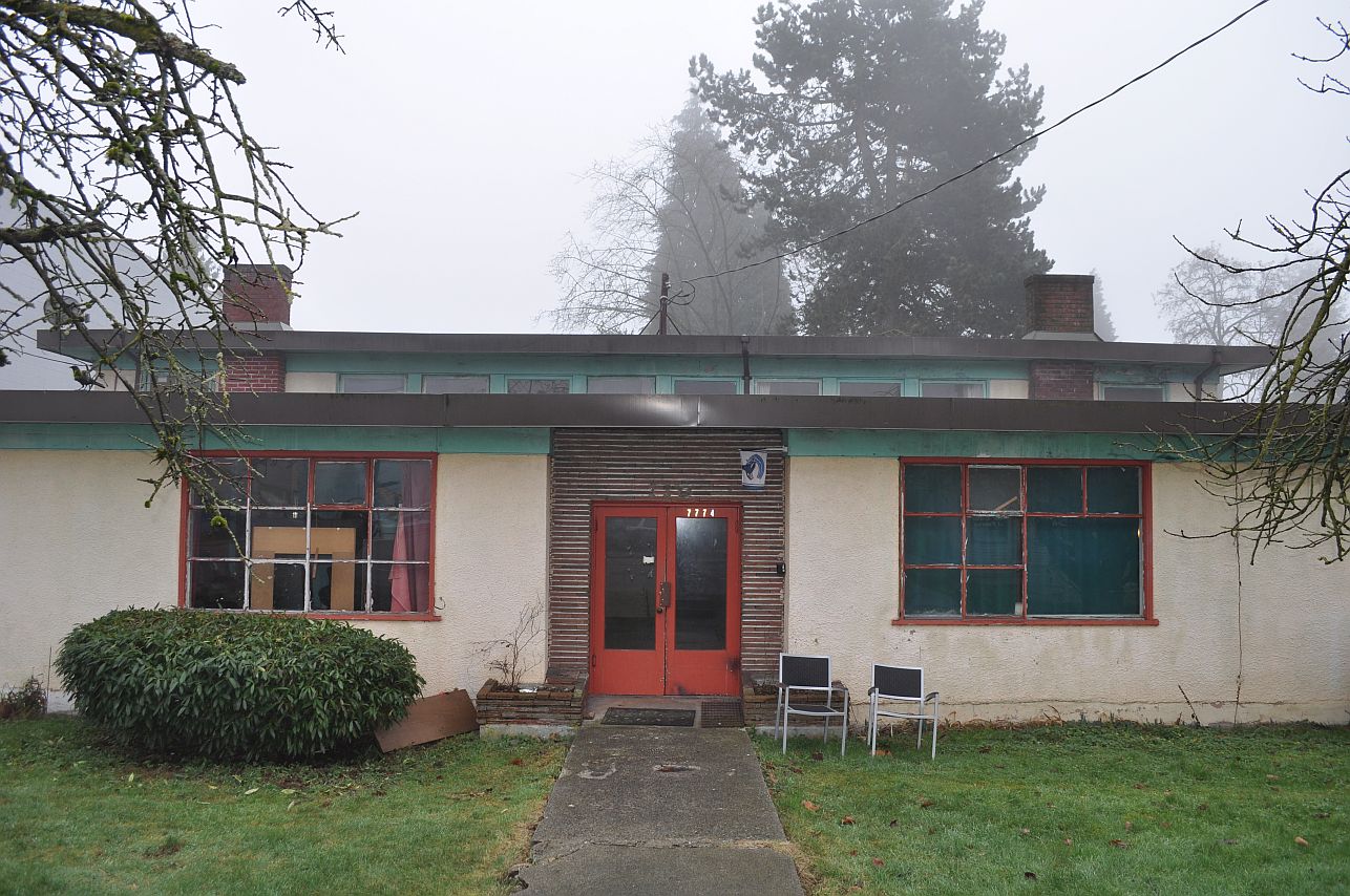 Edmonds Street just east of the Town Centre boundary, foggy morning: drive-thru burger stand under renovation, dance studio, lumber wholesaler