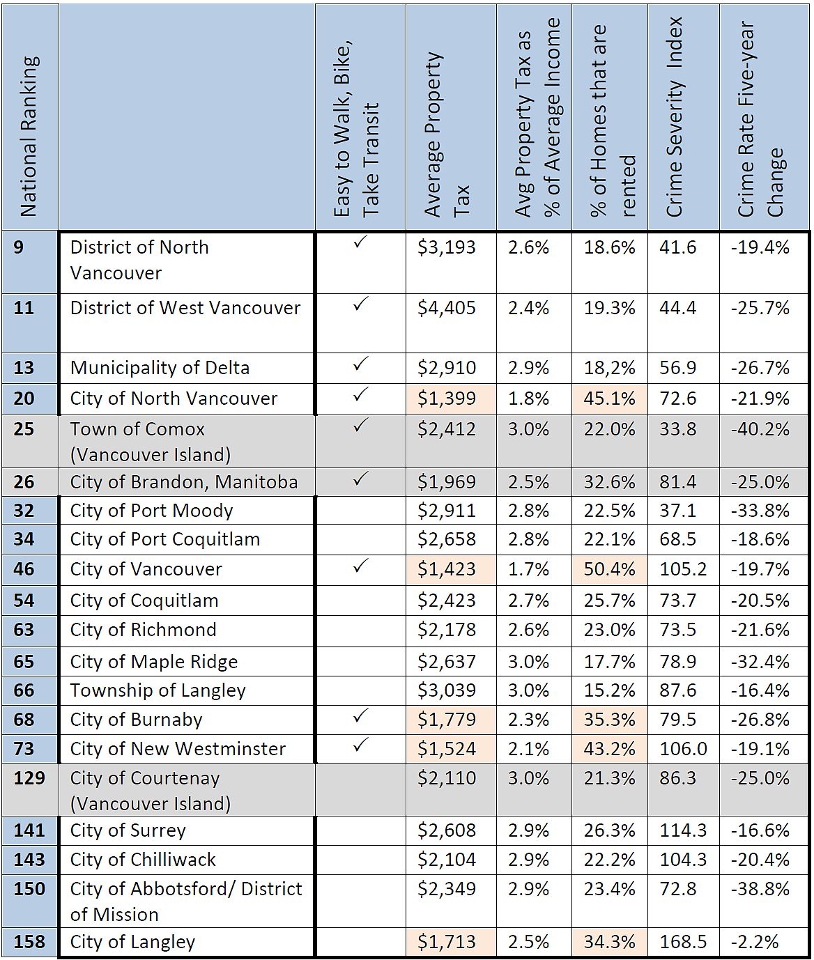 The District of North Vancouver is British Columbia’s top-ranking municipality, in ninth place nationally. Port Alberni, a Vancouver Island town that I would personally rate as Not Too Bad, sits at 207.