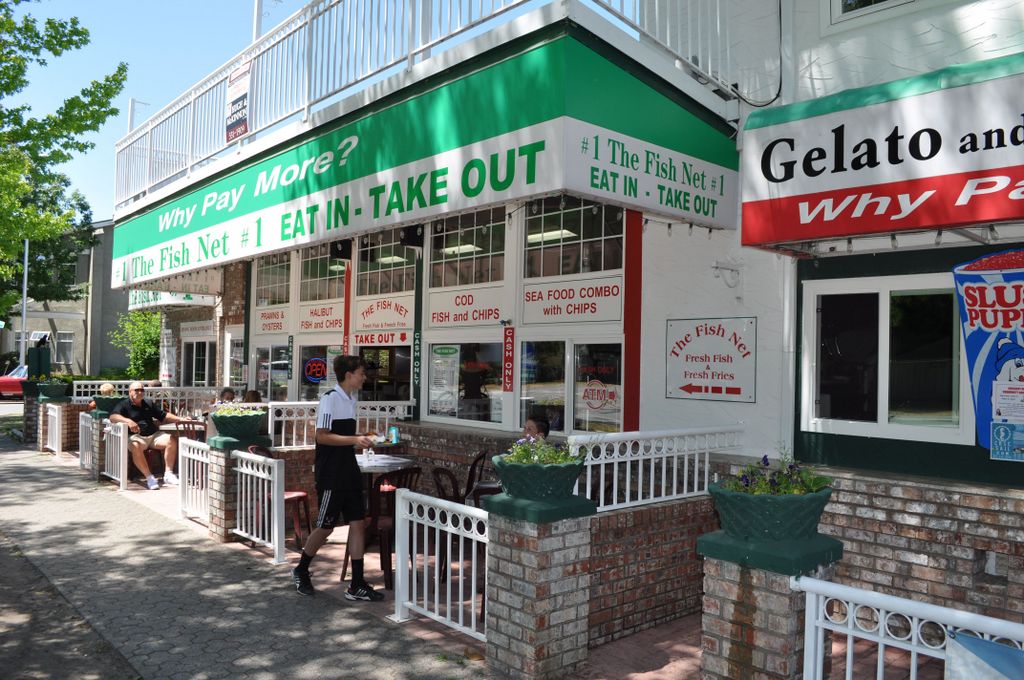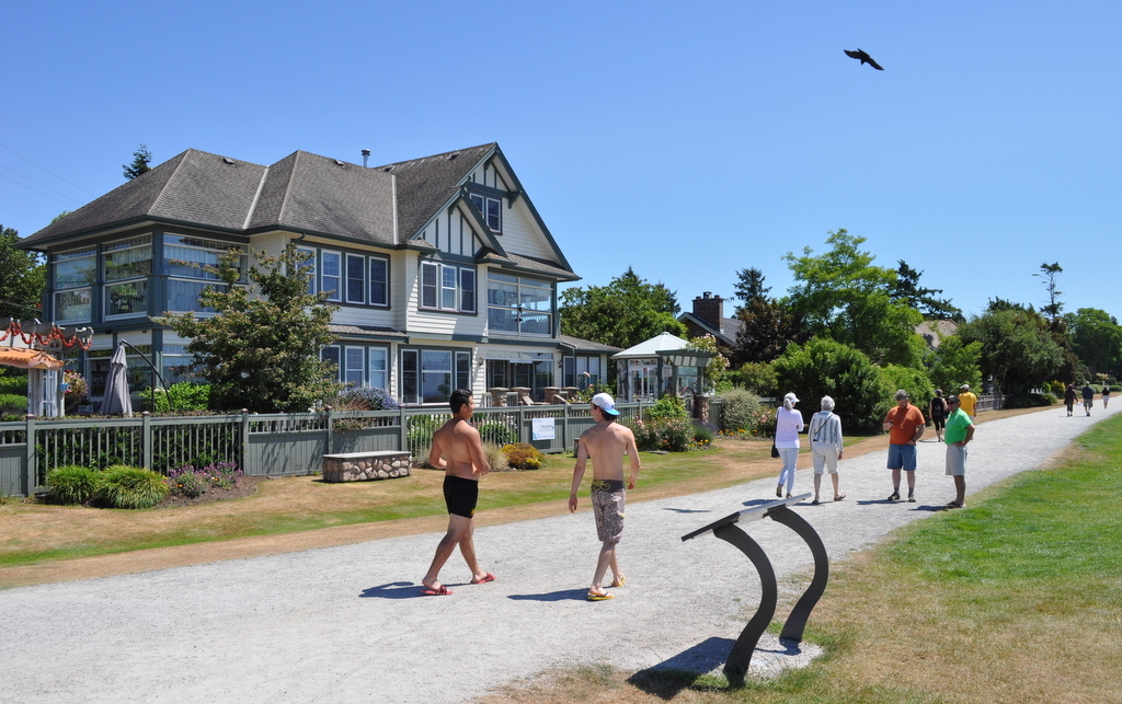 Commercial use, about six intermittent walkable blocks of it (counting both sides of the street), is bunched up along the western end of Beecher Street. Other than a couple of professional offices and a yoga studio or two, most commercial space is taken up by cafes. In season, hundreds or thousands of people arrive in Crescent Beach every day to stroll on the dyke or play on the shore. Some stop at the cafes for ice cream or fish and chips.