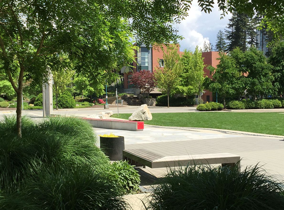 The walkable urban village at Coquitlam City Centre has emerged recently, with a new area of residential towers, neighbourhood offices and cafes, bridging Douglas College and an area of older housing to the vehicle-dominated Coquitlam Centre megamall.