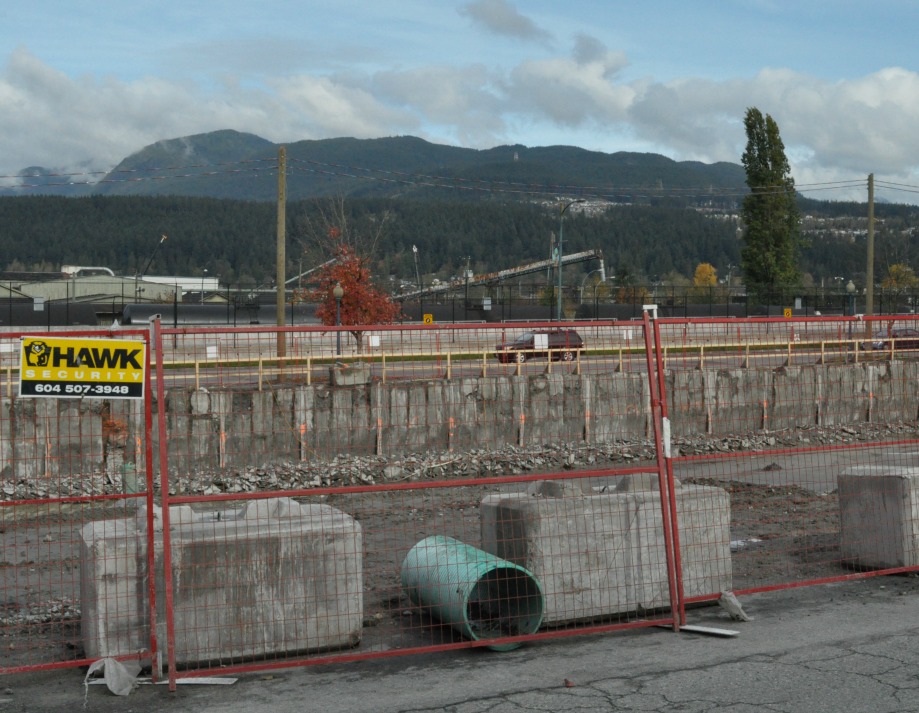 The pedestrian ambience along the walking route proposed by Google is often unpleasant. Vehicle traffic is fast and noisy, especially on the 55-minute downhill stretch between Burquitlam and Moody Centre. We veered off onto side streets as much as possible. At the bottom of one forest path we hopped down onto the overgrown site of the old Barnet Hotel, considered and then rejected for use as a SkyTrain station. Digging and constructing, as expected, is concentrated near the almost-completed transit stations.