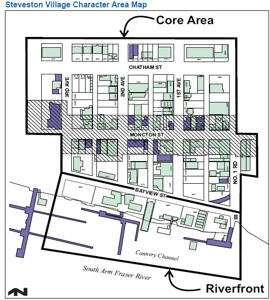 The City of Richmond’s 2009 area plan sets development restrictions that are intended to maintain a heritage flavour in the core area and the modest scale of the street-facing shops. The economic driver for the original village, the working harbour and adjacent industrial lands, is under some stress; you still see a large fishing fleet moored near the boardwalk, but the harbour-related industrial properties are being converted for mixed use with housing, more shops and parking garages.