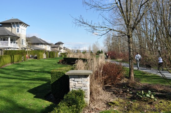 Osprey Village, a Pitt Meadows neighbourhood overlooking the Fraser River, was built over the past decade with patience and (I think) good taste, at least compared with the competition in other Fraseropolis suburbs. The commercial zone pictured above is short on everyday services and heavy on dog spas and craft galleries, but it’s attractive and cozy, and is now a mini-tourism destination for cyclists and for families looking to walk along the river. (Osprey is at the western end of a regional pathway network, and not far from the Golden Ears Bridge; cycling links to Coquitlam and Langley are excellent.) The land use plan adopted by City Council in 2009 provides for up to 25 live-work units on the main street or immediately behind, and the community hall by the river park acts as a regional conference centres, so there’s continued pedestrian traffic in the Osprey village centre even on weekdays.