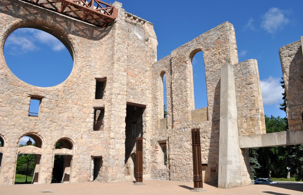 The facade of the old St. Boniface Cathedral, preserved after a devastating fire in 1968. The new cathedral sits just a few metres away.
