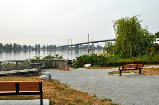 At the western end of the initial route, a view of the Fraser River from Emmeline Mohun Park on Wharf Street, Maple Ridge. Most photos in this series were taken under smoky skies during the 2018 wildfire season