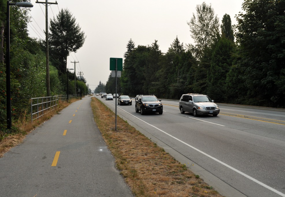 A recently opened multi-use path along Lougheed Highway is part of the proposed route. Noisy but safe, the need to include this feature shows the scarcity of east-west cycling choices in a car-dependent city stretched along the Fraser River. The hospital, with no through traffic, sits to the south of this location, and the city cemetery lies conveniently to the north.