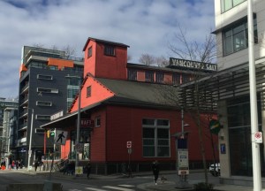 A food truck on the main square in Southeast False Creek. The square features an upscale supermarket and a drug store, but is dominated by oversize pubs.